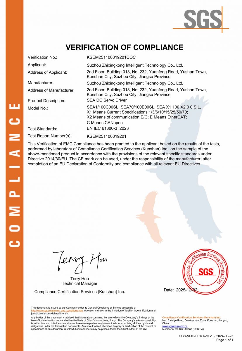 精越科技SEA高性能直流伺服驅(qū)動產(chǎn)品通過SGS的CE認(rèn)證。SEA驅(qū)動器以較高的性能表現(xiàn)一次性通過SGS認(rèn)證,這標(biāo)志著SEA驅(qū)動器的性能得到了世界級實驗室的權(quán)威認(rèn)可。